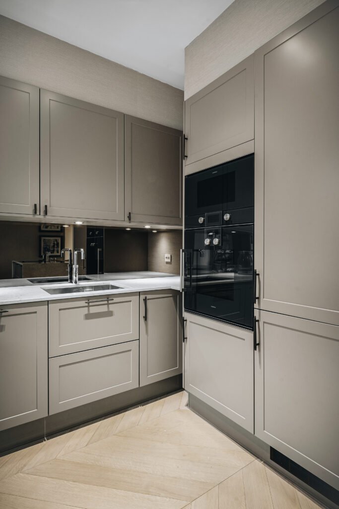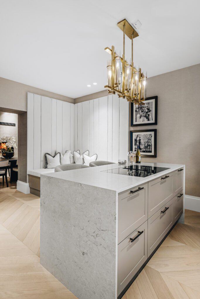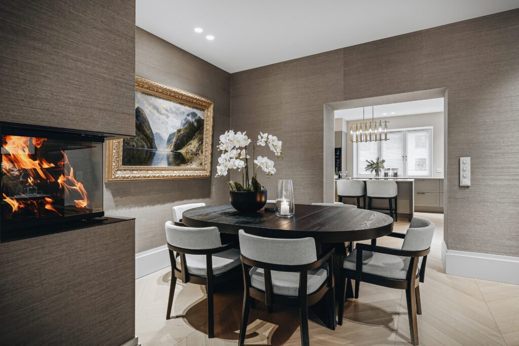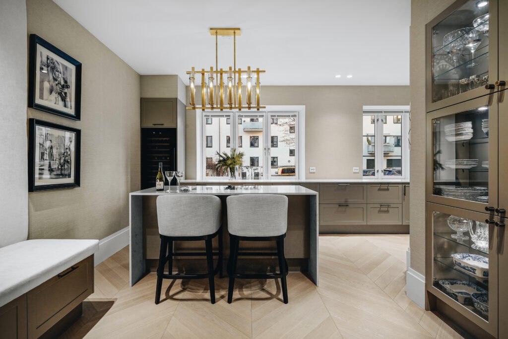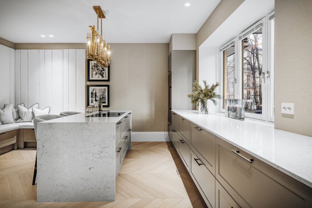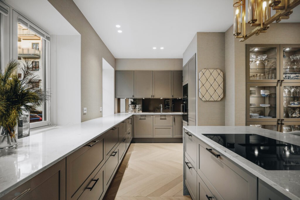 Kjøkkenet er utformet med rene linjer, integrerte løsninger og materialer som gir et eksklusivt, men dempet preg. Den store kjøkkenøya fungerer både som arbeidsflate og sosialt samlingspunkt, mens spesialtilpasset innredning, vitrineskap og sittebenk gir leiligheten mer karakter og bedre utnyttelse av arealet. I oppholdsrommene er det lagt vekt på varme toner, presise overganger og faste elementer som skaper ro, dybde og en tydelig helhet.