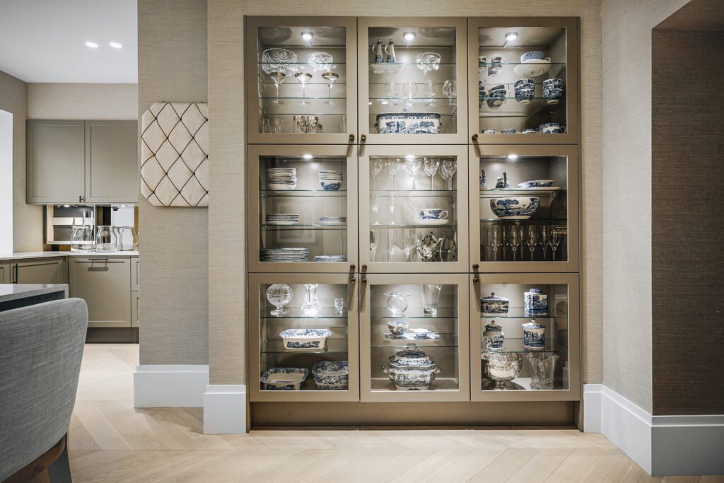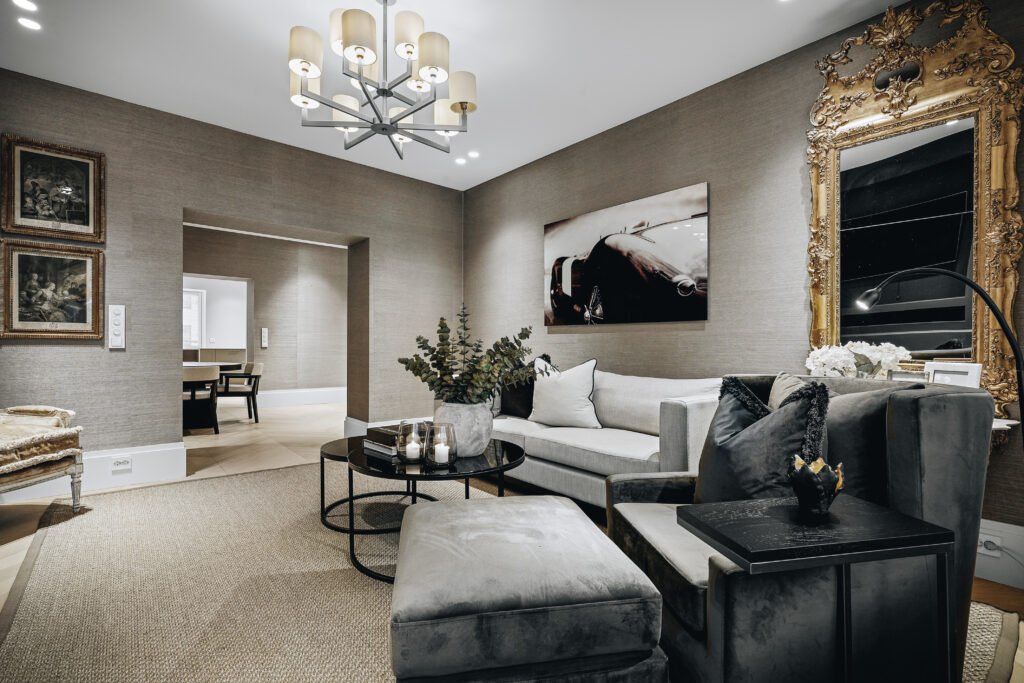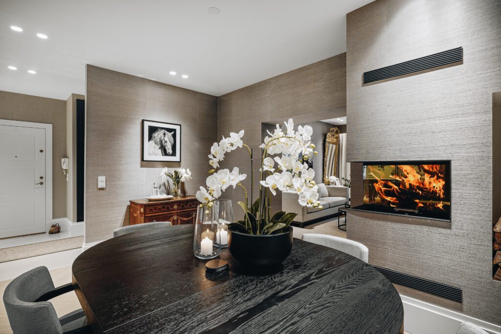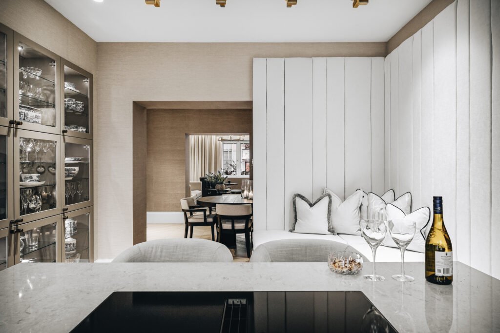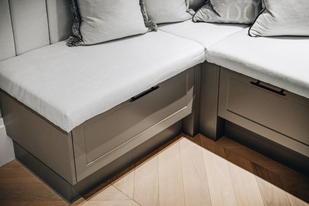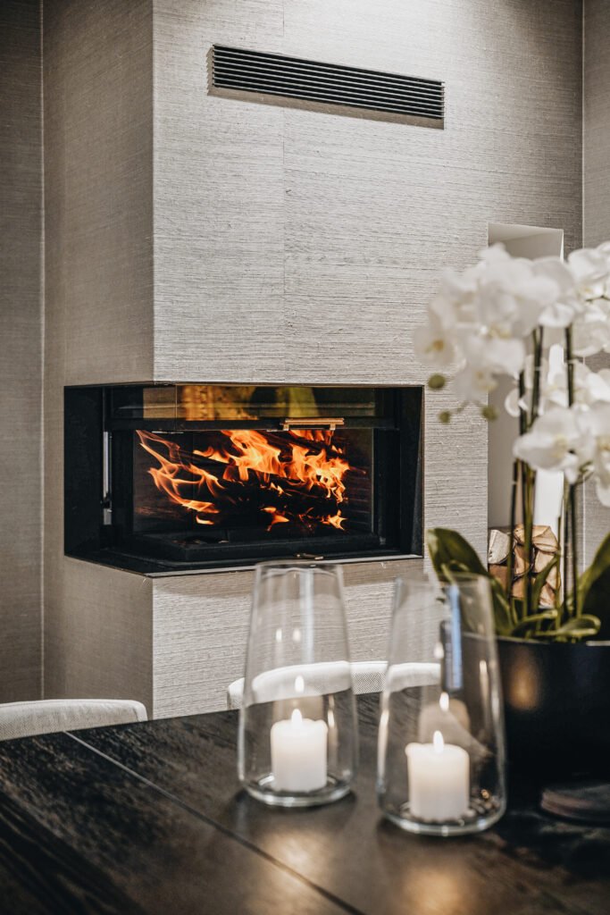 Kjøkkenet er utformet med rene linjer, integrerte løsninger og materialer som gir et eksklusivt, men dempet preg. Den store kjøkkenøya fungerer både som arbeidsflate og sosialt samlingspunkt, mens spesialtilpasset innredning, vitrineskap og sittebenk gir leiligheten mer karakter og bedre utnyttelse av arealet. I oppholdsrommene er det lagt vekt på varme toner, presise overganger og faste elementer som skaper ro, dybde og en tydelig helhet.