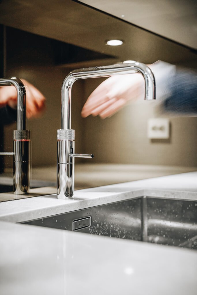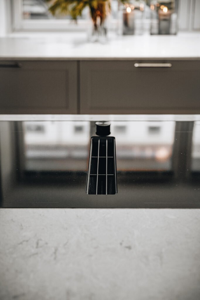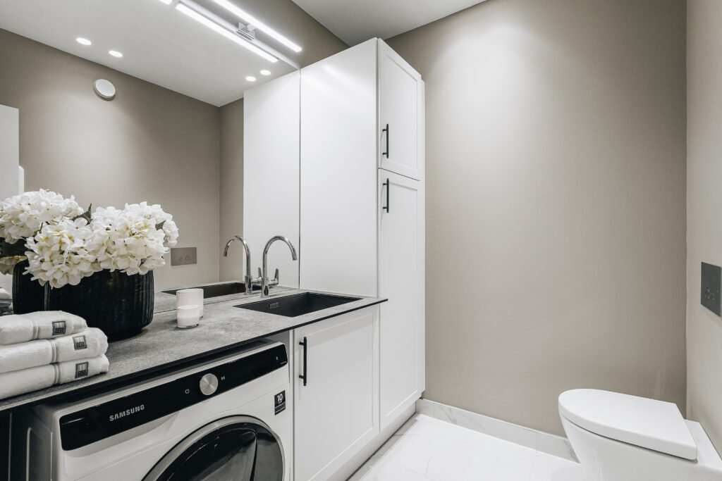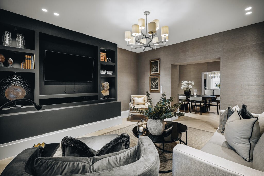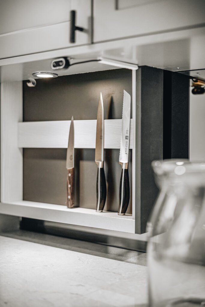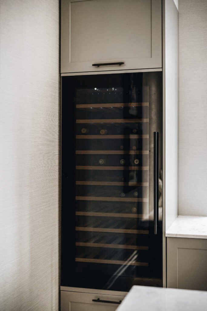 Kjøkkenet er utformet med rene linjer, integrerte løsninger og materialer som gir et eksklusivt, men dempet preg. Den store kjøkkenøya fungerer både som arbeidsflate og sosialt samlingspunkt, mens spesialtilpasset innredning, vitrineskap og sittebenk gir leiligheten mer karakter og bedre utnyttelse av arealet. I oppholdsrommene er det lagt vekt på varme toner, presise overganger og faste elementer som skaper ro, dybde og en tydelig helhet.